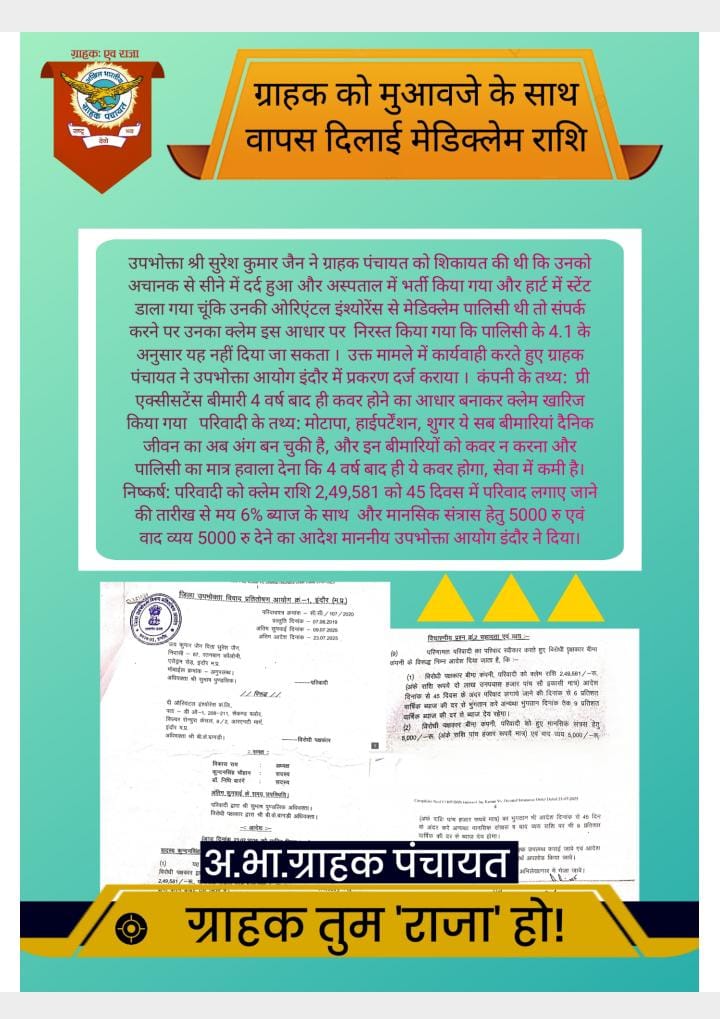 इंदौर, 24 जुलाई 2025: उपभोक्ता आयोग इंदौर ने एक मामले में बीमा कंपनी को ₹2,49,581 की क्लेम राशि 6% वार्षिक ब्याज सहित 45 दिनों के भीतर अदा करने का आदेश दिया है। साथ ही ₹5000 मानसिक क्षतिपूर्ति तथा ₹5000 वाद व्यय के रूप में अतिरिक्त भुगतान करने के निर्देश भी दिए गए हैं।
