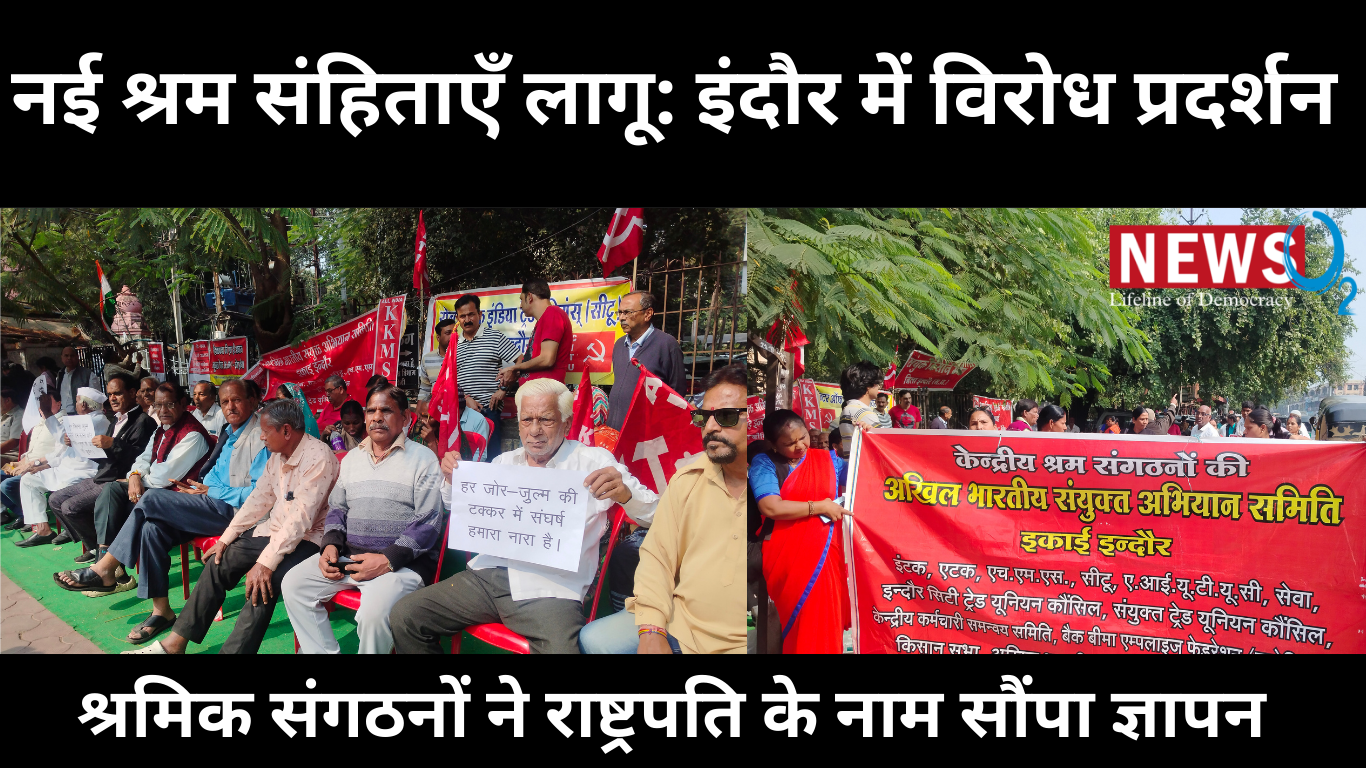 इंदौर, 26 नवंबर 2025: केंद्र सरकार द्वारा 21 नवंबर 2025 से लागू की गई चार नई श्रम संहिताओं के विरोध में आज इंदौर में विभिन्न मजदूर संगठनों ने बड़े पैमाने पर प्रदर्शन किया। सुबह से जुटे प्रदर्शनकारियों ने संभागायुक्त कार्यालय के बाहर नाराजगी जताई और महामहिम राष्ट्रपति के नाम एक संयुक्त ज्ञापन सौंपा।